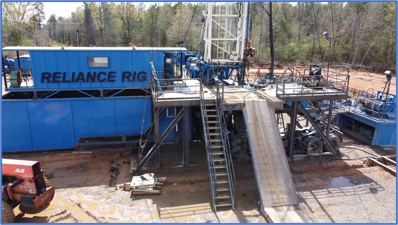 Figure 1: Drill rig at the Beulah-Taylor #1 well re-entry site in Lafayette County, Arkansas. This reused a pre-existing drill pad (note existing powerline running through the wellpad area). The drill rig has since demobilized from this location after reaching a total measured depth of 8,940 ft,and has been replaced by a workover rig to complete perforations, final testwork and sampling.