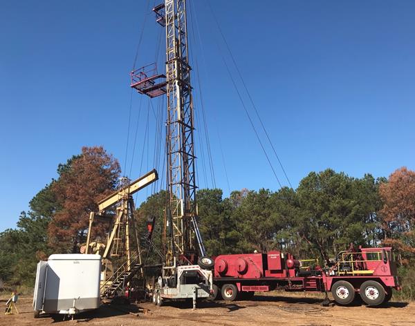 Figure 2: Workover rig at the pre-existing production well in East Texas. This rig was used to re-perforate the existing production casing to allow brine sampling from various zones in the Smackover Formation.